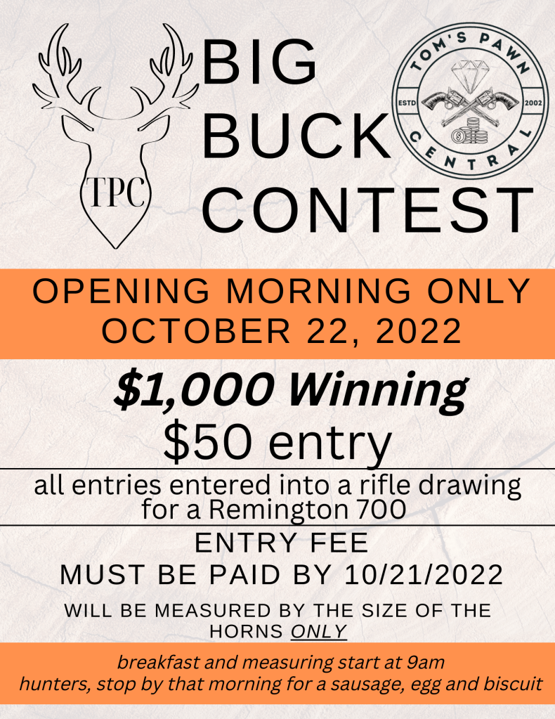 Tom’s Pawn Central Blog CLICK HERE TO VISIT OUR BRAG WALL 2023 Metter Turkey Dinner Click here to Find us on Facebook 2023 OPENING DAY TURKET CONTEST Youth Turkey Photo Contest 2023 Youth Turkey Opening Day How it started Info on 2022 Turkey Banquet Tom’s Pawn Central Christmas Gift Guide Swainsboro Chamber Spotlight Jewelry Show Safe Haven Fundraiser TPC BIG Buck Contest RETURNING TO DOWNTOWN METTER Another Bloomin’ Cornhole & Wing Contest Celebrating 20 years! 1ST ANNUAL KING THUNDER CHICKEN CONTEST NEW ITEMS AT METTER BAIT-N-TACKLE 10 10 10 LAYAWAY Get new content delivered directly to your inbox. Enter your email address Sign Up
